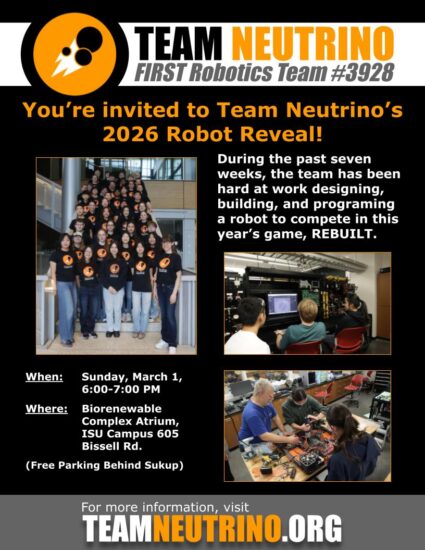 Come join us on March 1st, from 6:00-7:00 PM at the Sukup Atrium for our robot reveal as we dig into the new 2026 season, REBUILT!