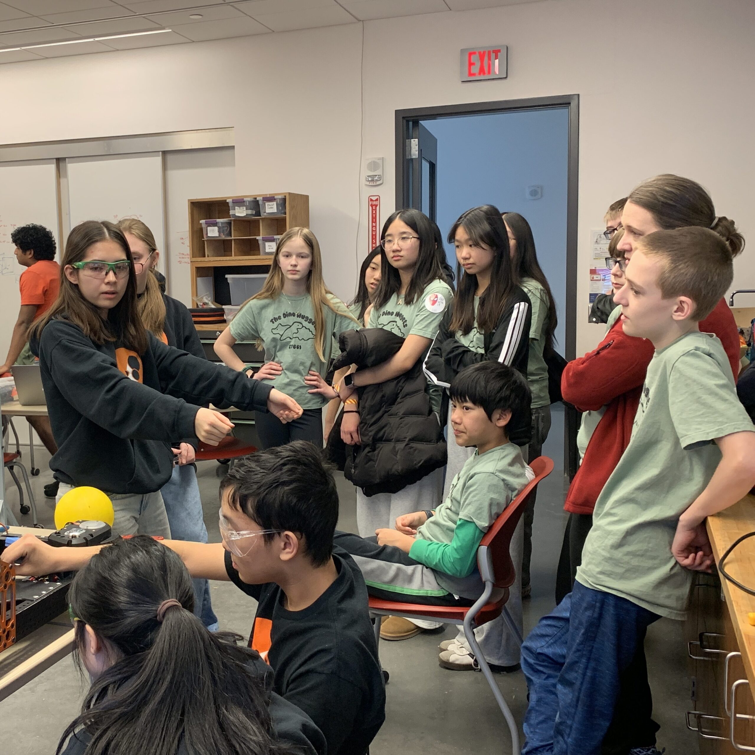 On Saturday Febuary 7th, one of our mentored FLL teams went to the state championship. At this event hosted by our sponsor, Iowa State University, they were able to compete and present for a chance at nationals. Once they were done competing, we took them next door for a tour of our workspace and a chance to see our in-progress robot while we worked. This was very fun for both our team members and our FLL team, The Dino Nuggies!