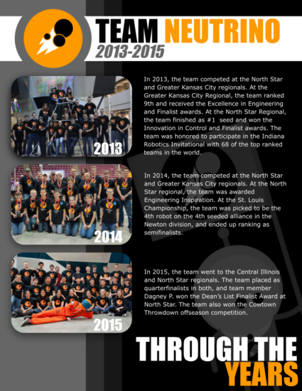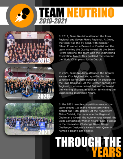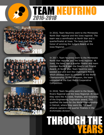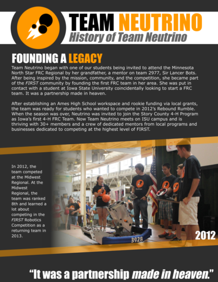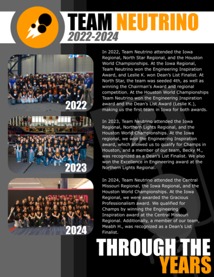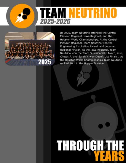 Team Neutrino was founded in the fall of 2012 by a high school and ISU student, both inspired by the FIRST community. Later becoming Iowa’s first 4-H FRC Team, Team Neutrino is now thriving with nearly 14 years of experience, 4 Regional Winner Awards, 2 Chairman’s Awards, 10 consecutive years of Engineering Inspiration Award, and a dedicated crew of 30+ members ready to compete at the highest level of FIRST.